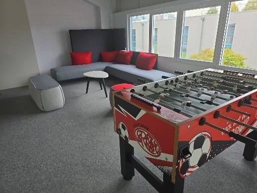 Für Pausen und Ausgleich stehen ein Aufenthaltsbereich mit Steel-Dart, Poolbillard und Kicker sowie eine voll ausgestattete Küche mit Kaffee-Bar zur Verfügung.